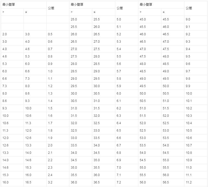 管材的最小壁厚 ey,min等儀公稱壁厚en。管材任一點的壁厚公差應符合表 9 的規定。