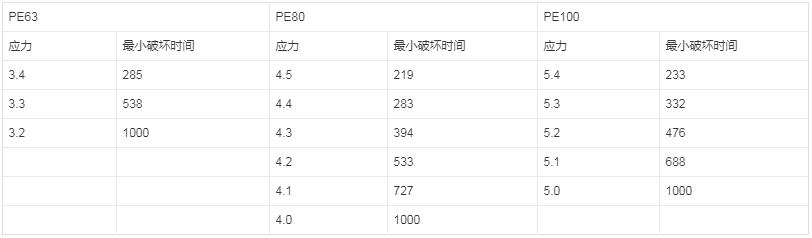 80°C靜液壓強度(165h)試驗只考慮脆性破壞。如果在要求的時間(165h)內發生韌性破壞,則按表11選擇較低的破壞應力和相應的最小破壞時間重新試驗。